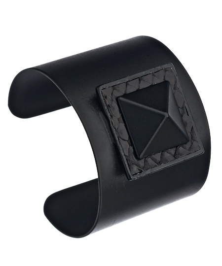 The Ted Rossi black matte pyramid cuff gives your wardrobe a touch of mystery and elegance. The Egyptian inspired pyramid is centered at the top of the metal cuff and bordered with a python leather crafted angular frame. Perfect for a luxurious night on the town and to complete your edgier look.