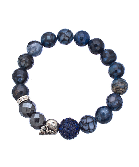 This flirtatious blue fire skull bracelet from Very Me is the perfect accent for your favorite pair of designer jeans! It combines round blue agate beads with two faceted hematite stones and a sparkling navy blue crystal ball. Add an edgy silver skull charm, and you have an accessory that catches the eye.