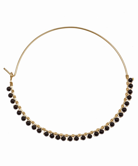 Wendy Mink large black onyx hoop earrings are simply chic. These lightweight 22k yellow gold vermeil hoops are perfect for everyday wear. The bottom half of each earring is wrapped with small black onyx stones for a fabulously dramatic look. Earrings measure 2 1/4 inches in diameter. French wires for pierced ears.