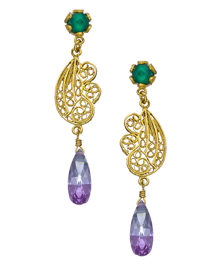 The green onyx filigree drop earrings from Yvone Christa will probably make your day. The tulip cup post that holds the green onyx stone includes a tiny paisley design and a lavender cubic zirconia stone hangs from the bottom. These earrings fasten with post back closures for pierced ears.