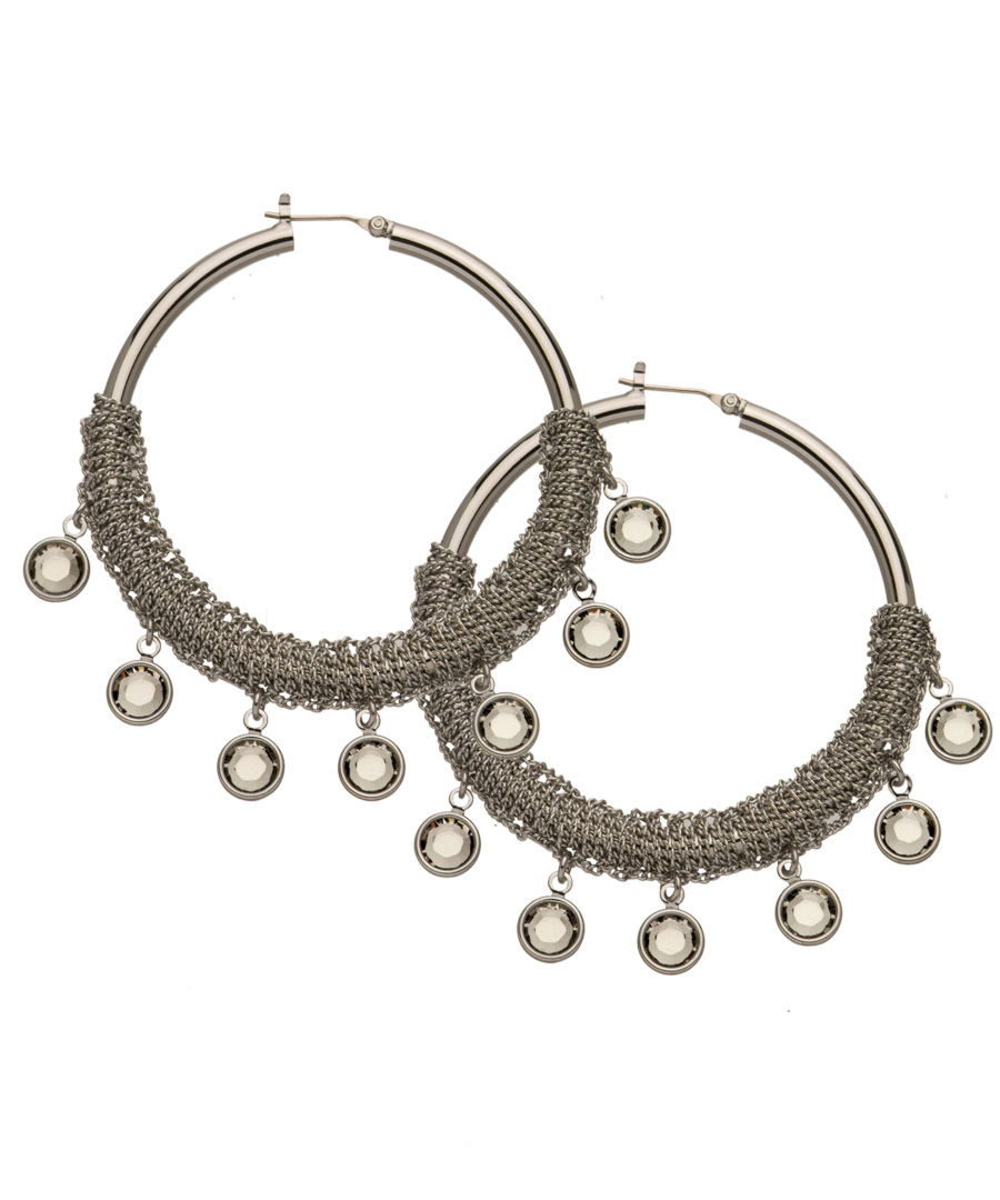 ABS silver wrapped black diamond hoop earrings are sensational. Gorgeous silver plated hoop earrings are wrapped with a delicate silver plated chain. Beautiful black diamond crystals dangle from the pieces. Snap bar closure for pierced ears.