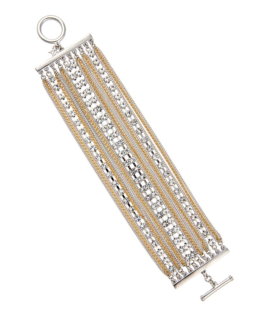 ABS wide chain bracelet is on the same line as the multi chain and crystal bracelet, but a wee bit smaller and more restrained. It still packs a mighty punch, with four strands of crystals and gold- and silver-plated chains. The bracelet lies alluringly on the skin and features a large toggle for easy wear.