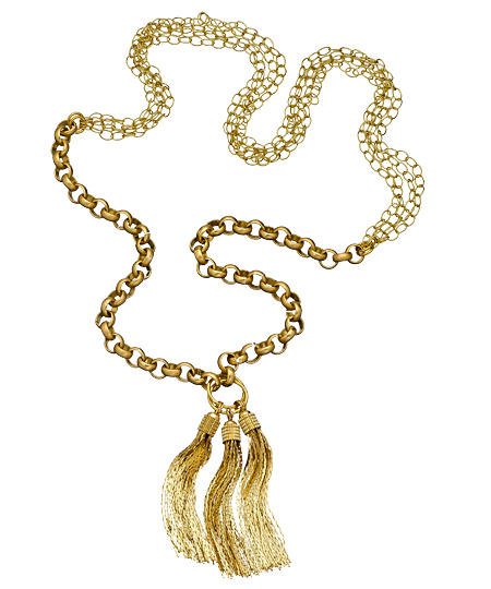 You've probably never seen anything like the gold city 3 tassel necklace from Ali NY. It's the perfect piece for dressing up your most modest looks. Several strands of oval chain connect with the rolo chain before linking with the 3 tassel pendant.