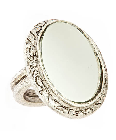 Get lost in a reflection with this mirror carved ring by Allison Daniel. The mirror pendant is completely usable, which adds to the unique quality of this ring. Finished in antique silver, the ring also includes designs of leaves, swirls and lines that are embedded on the outer trimming of the ring.