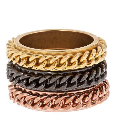 The Alvina Abramova chain stacking Angie rings are proof that good things can come in threes. This set of three bands is circled with a tiny chain-link detail and plated in yellow gold, gunmetal, or rose gold. Wear them all at once to quickly build up a chic look.