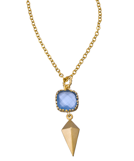 Alvina Abramova's gold and blue Victoria pendant necklace is the epitome of sophisticated elegance, with its mesmerizing blue, faceted stone that supports a golden spike. The pendant hangs from a strong but delicate looking gold chain that fastens with a lobster claw clasp.