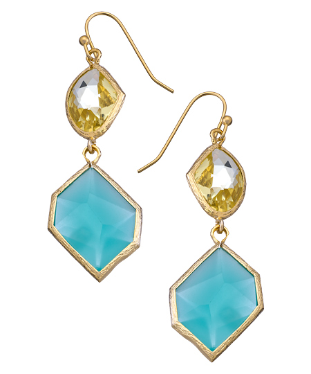 These Alvina Abramova gold, blue and yellow Joyce double drop earrings are fit for a queen, but also affordable for all her subjects! The exquisitely crafted stones are irregularly shaped, bezel set in textured gold and linked to provide movement when you turn your head. Speaking of turned heads, these gorgeous earrings are sure to be noticed. Earrings have a french wire closure for pierced ears.