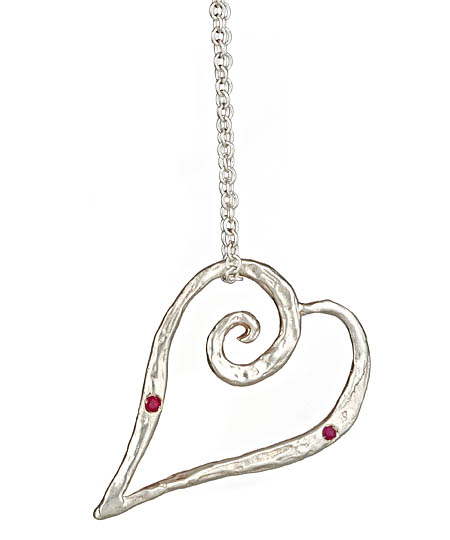 The Amery Carriere ruby and sterling silver scroll-heart pendant necklace burns brightly with a total of five glowing rubies on both sides. The red stones pop against the textured sterling silver pendant. The matching cable chain loops through the top corner of the curvaceous heart for a modern touch. A heart-detailed lobster-claw clasp fastens the 18-inch chain.