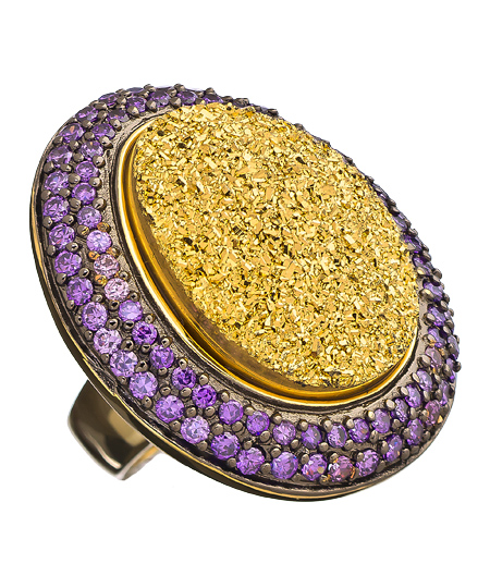 If you're trying to finish off a look that was made to impress, try the big bold statement druzy ring from Andara. The egg shaped ring would make a swanky addition to any jewelry collection. A black rhodium border blends in with the purple cubic zirconia which surrounds the gold druzy stone.