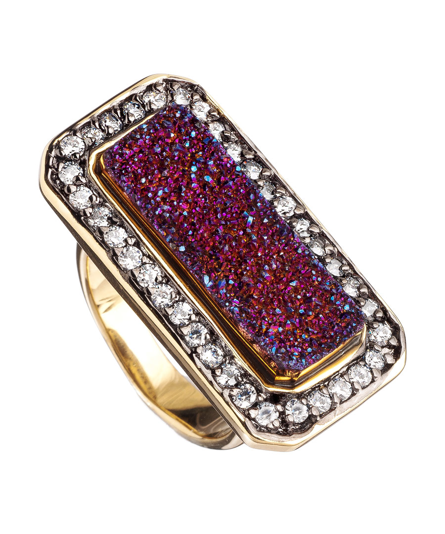 Go from dull to dazzling with this Andara east west purple druzy ring. The gold ring's rectangular face runs long ways across your finger with radiant purple druzy set at its center. The purple druzy is bordered with shimmering cubic zirconia stones.