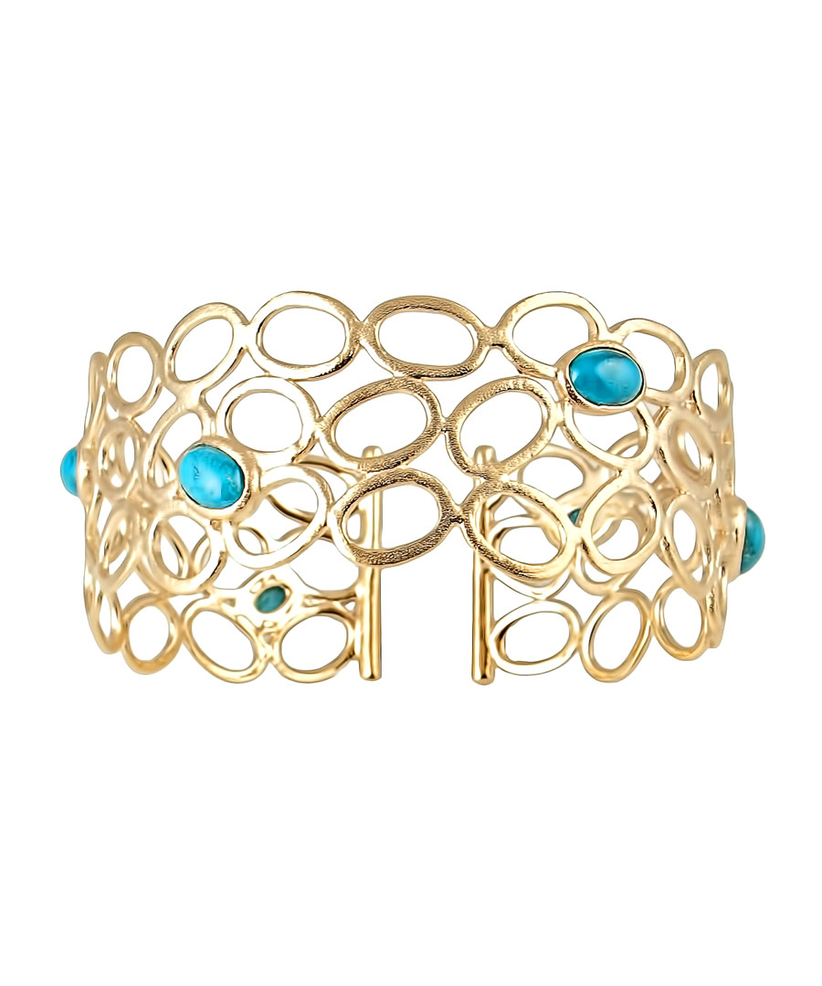 This howlite turquoise cuff by Andara is a luminous piece with an interesting flair. The 18k gold plated cuff features a base metal and six howlite turquoise stones. Oval shapes are styled throughout the cuff with the turquoise stones added as shimmering accent pieces.