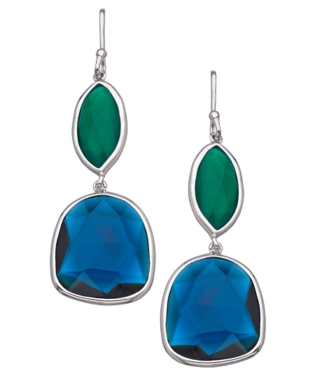 Adorn your ears with the dreamy color combination of Andara's irregular green onyx & blue glass earrings. The rhodium plated double drops offer an enchanting presence with faceted gemstones in a warped design. This pair includes french hooks for pieced ears.