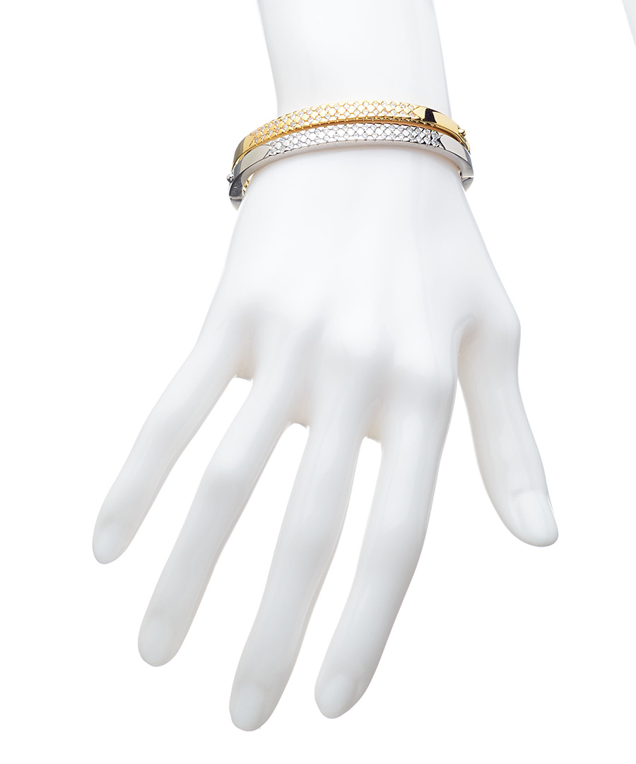 Unlock the secret to exceptional beauty. Andara's metal crystal bar hinged bangle reveals a timeless, heirloom-quality look, giving you access to riches and treasures beyond compare. It's offered in your choice of gold or silver plated.