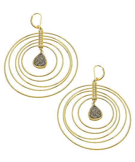 Styled for maximum impact, these bold pair of multi circle silver druzy earrings from Andara add a dose of high drama to any outfit. A silver druzy teardrop is orbited with multiple gold plated rings. Replace those boring hoops with a pair of these beauties.