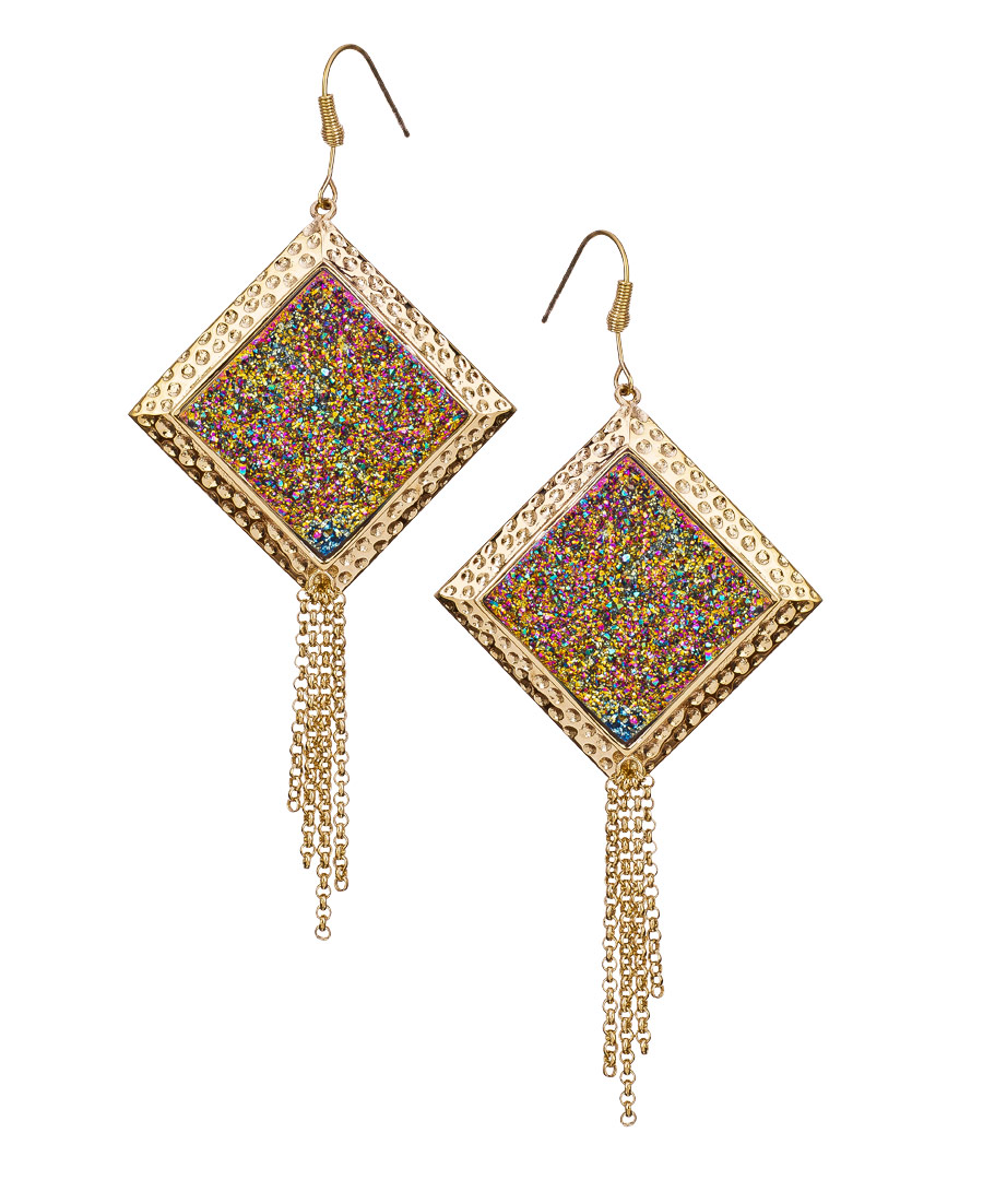 Twinkle like a star with these peacock druzy earrings by Andara. The beautiful design features a diamond shape sparkling druzy with four 18k gold plated tassels hanging from their ends. The ear wire backing is ideal for easy wearing. With these earrings you are sure to shine.