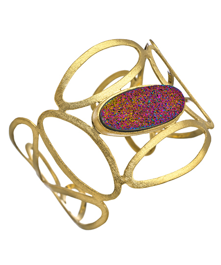 The open style of the peacock druzy station cuff from Andara sits boldly over your wrist with luxe detail and colorful charm. It features a fabulous multi colored druzy ornament set on a decorative gold plated cut out cuff. Wear it to create a striking ensemble.