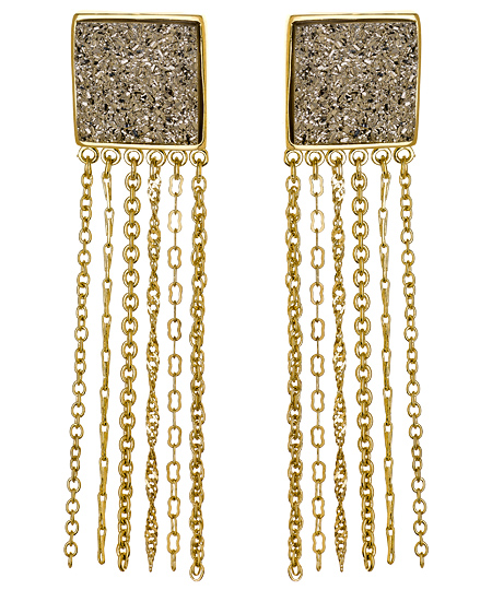 Mixing gold and silver tones is easy when you can start things off with a pair of earrings like the silver square druzy tassel chain earrings from Andara. You'll love how well the silver druzy and gold plated metals work together. These earrings fasten with an omega back and butterfly nut for pierced ears.