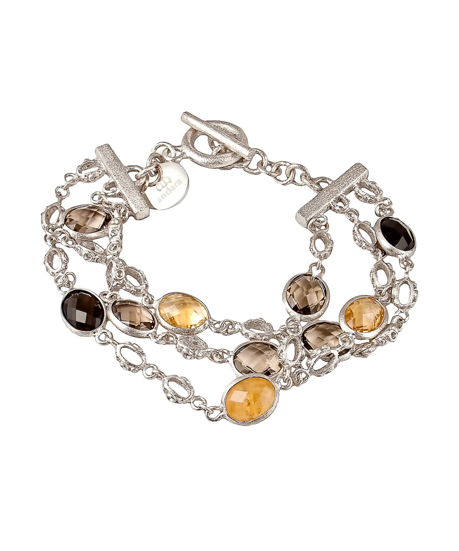 This dazzling Andara smoky quartz and citrine bracelet features three strands decked in beautifully decorated gems. Each strand includes both stones in smoky quartz and citrine. The gems are linked by a silver rhodium chain and the bracelet is completed with a toggle closure.