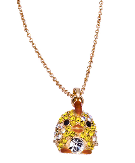 The crystal chick pendant necklace from Andrew Hamilton Crawford wins in the categories of uniqueness and adorability! What's extremely unique about this necklace? The chick pendant has a little jingle bell inside so that you can jiggle the little birdie and make it chirp!