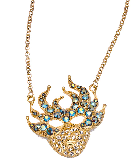 This eye-catching crystal masquerade pendant necklace from Andrew Hamilton Crawford is ready for the grand ball! The crystallized mask pendant features opalescent and clear crystals with the eyes cut out. The necklace is one of those rare finds that's sure to turn strangers into new, admiring friends.