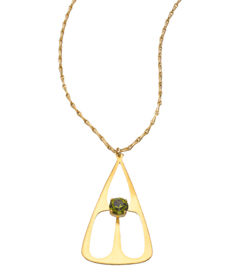 A sparkling olivine Swarovski crystal serves as the centerpiece to Angel Court's gorgeous Casablanca necklace. The unique angular cut-out pendant hangs prominently on a long textured link chain. Wear it as a distinctive anytime piece.