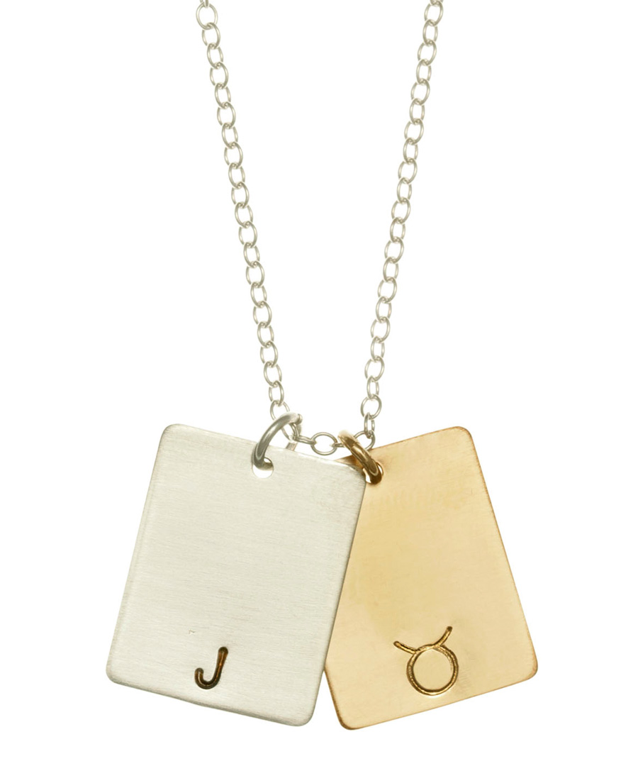 Make a connection with the initial and zodiac double tag pendant necklace by Anna Bee Jewelry. Themixed metal pendants will represent an initial and zodiac sign of your choice. The sterling silver pendant will be hand-stamped with the initial and the gold-fill pendant will be hand-stamped with the zodiac sign. These gorgeous tag pendants hang from a sterling silver chain.