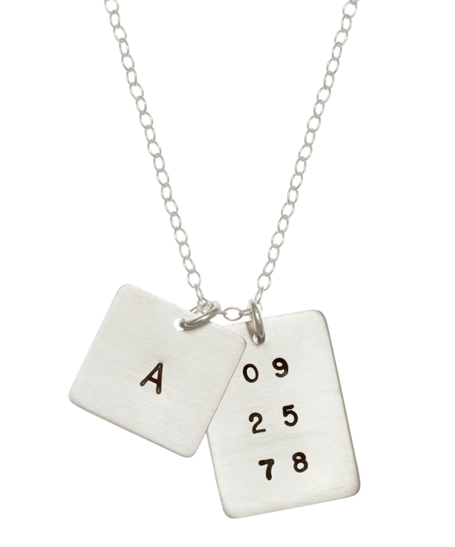 Commemorate an important moments in your life with this square initial and date tag pendant necklace by Anna Bee Jewelry. The square pendant will be personalized with an initial and the other will be customized with a six character date. Please write the six digits in the order you would like them to appear, starting from the top left to right and so on for each remaining row. The polished pendants are available in your choice of sterling silver or gold fill and hang from a matching chain.