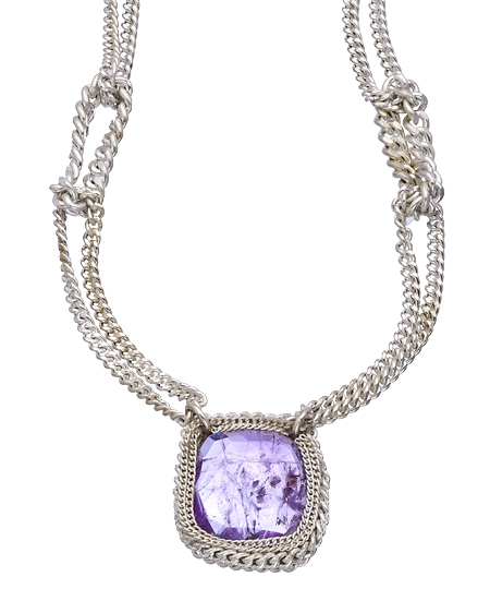 The ametrine chain wrapped necklace from Annie Hammer creates a stunning jewelry accent that's simply stunning. From the pretty amethyst-colored pendant to the decorative silver plated loop chain, this necklace tops the list for stylish femininity.