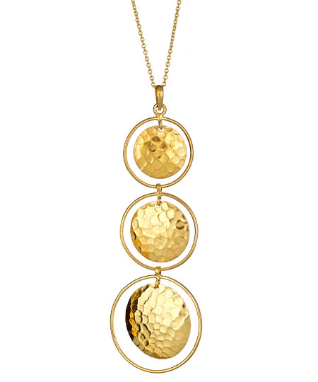 Anya Jewels triple disc drop necklace in 24K gold vermeil just keeps looking better and better. Three hoops graduate in size from ¾ inch to 1 inch, each containing a hammered gold disc that plays with light and depth.