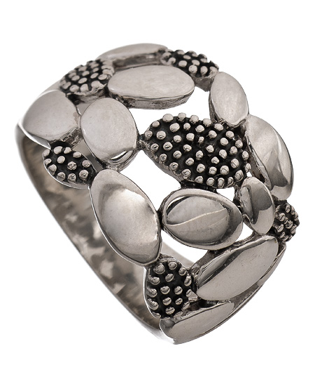 The dainty silver ring from Argento Vivo is about as precious as they get. The impressive design uses cut out ovals of varying sizes in both flat and dotted textures. It has an almost floral feel to it which lends itself well to most delicate looks.