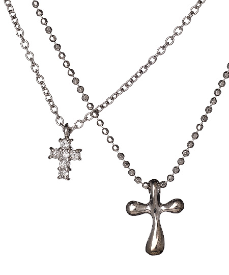 This double cross pendant from Argento Vivo is dainty and understated. The sterling silver beaded chains shows off two cross pendants one of which is paved in prong set crystals. It's an elegant addition to any modest look. Lobster claw closure.