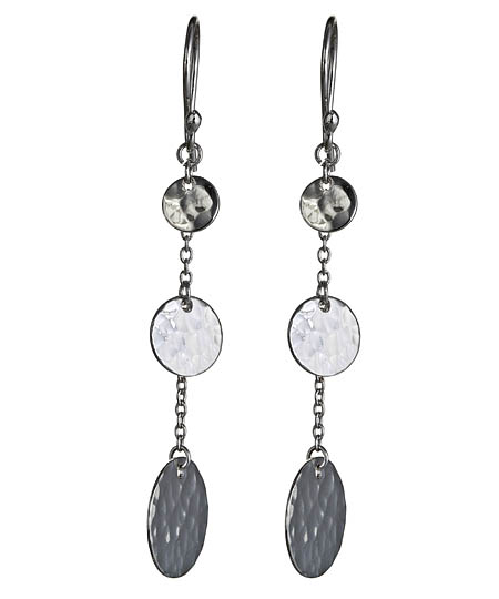 Dangle these sterling silver drop earrings by Argento Vivo for an outstanding look. Featured are 3 sterling silver flat circle charms attached to a chain from one end of the charm. The flat circle hammered finish charms hang loosely to add a glimmering touch.