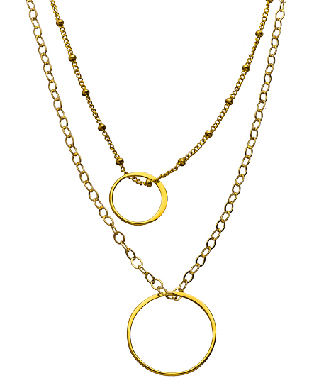 Don't pass up on the opportunity to add this double chain double ring necklace from Athena Designs to your jewelry collection. Two layers of chain, a beaded chain and cable chain come together to show off some gold fill rings. This necklace fastens with a spring ring closure.
