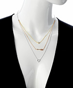 Layer it up with this heart and arrow tri-color necklace from Athra. The gorgeous layering effect brings out the beauty in each different colored chain. The gold chain holds one large CZ stone. The rose gold chain gleams with its sparkling arrow. The sterling silver heart is glitzy in CZ stones.