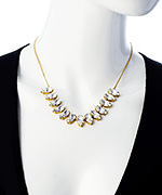 This A.V. Max gold and crystal navette stone bib necklace is amazing and lovely. Austrian crystal navette stones are lined up for drama in this simple, yet elegantly crafted, mini bib charmer. Necklace fastens with a lobster claw clasp.