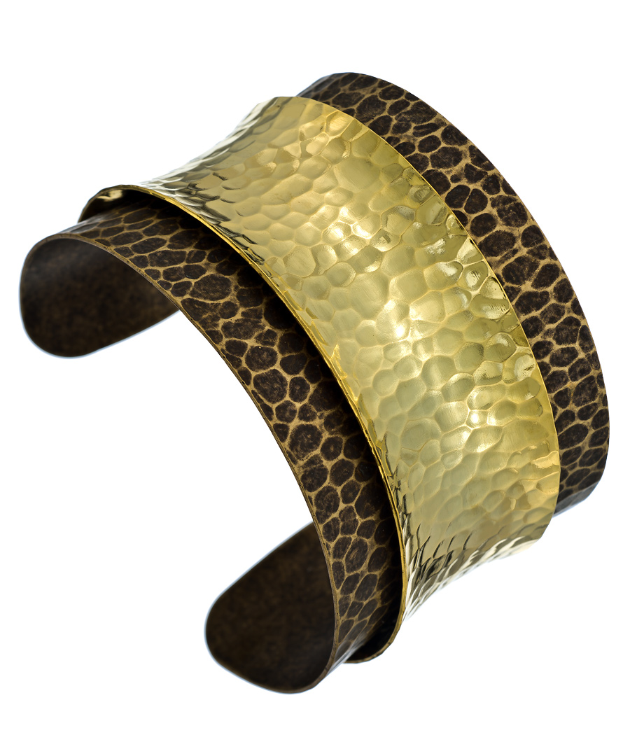 This A.V. Max gold and oxidized brass cuff bracelet is stunning and luxe. A rich background of hammered, oxidized brass provides the perfect backdrop fir the gleaming, hammered gold, smaller detail. This lovely cuff is guaranteed to elicit plenty of admiring glances.