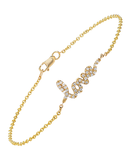 This 14kt gold and diamond 'love' bracelet from Avanessi is timeless jewelry you'll treasure forever. Perfect for everyday, it's also your ideal single accessory for understated evening glamour. The delicate but strong 14kt gold chain is joined by the gold, diamond lined 'love' detail. Bracelet fastens with a lobster claw clasp.