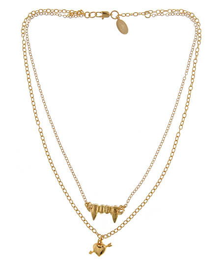 Be a femme fatale in this fang and heart double-strand necklace by Bee Charming. The long strand is accented by a heart pierced by a bow and arrow while a vampire-fang charm hangs from the shortest strand. This edgy chain necklace fastens with a lobster-claw clasp. Available in your choice of gold plate or silver plate.