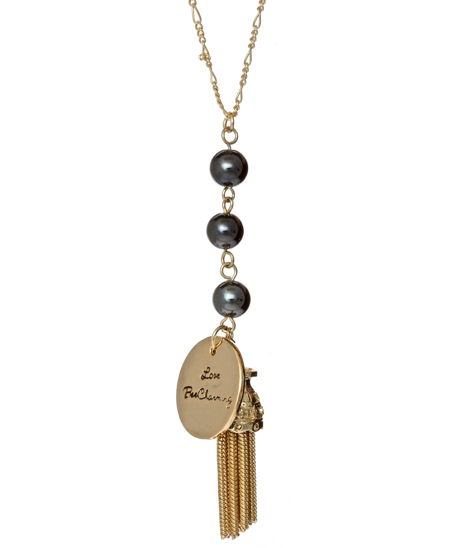 Bee Charming intuition and healing inspiration necklace is amazing. Three semi precious hematite beads are said to bring intuition and healing to the wearer. Hanging below the beads, a gold plated disc inscribed with "Intuition" and "Healing" and a gold plated tassel bring even more beauty to the piece. The pendant measures 3 inches long and hangs from a 26 inch gold plated Figaro chain with a 2 inch extension. Necklace fastens with a lobster claw clasp.