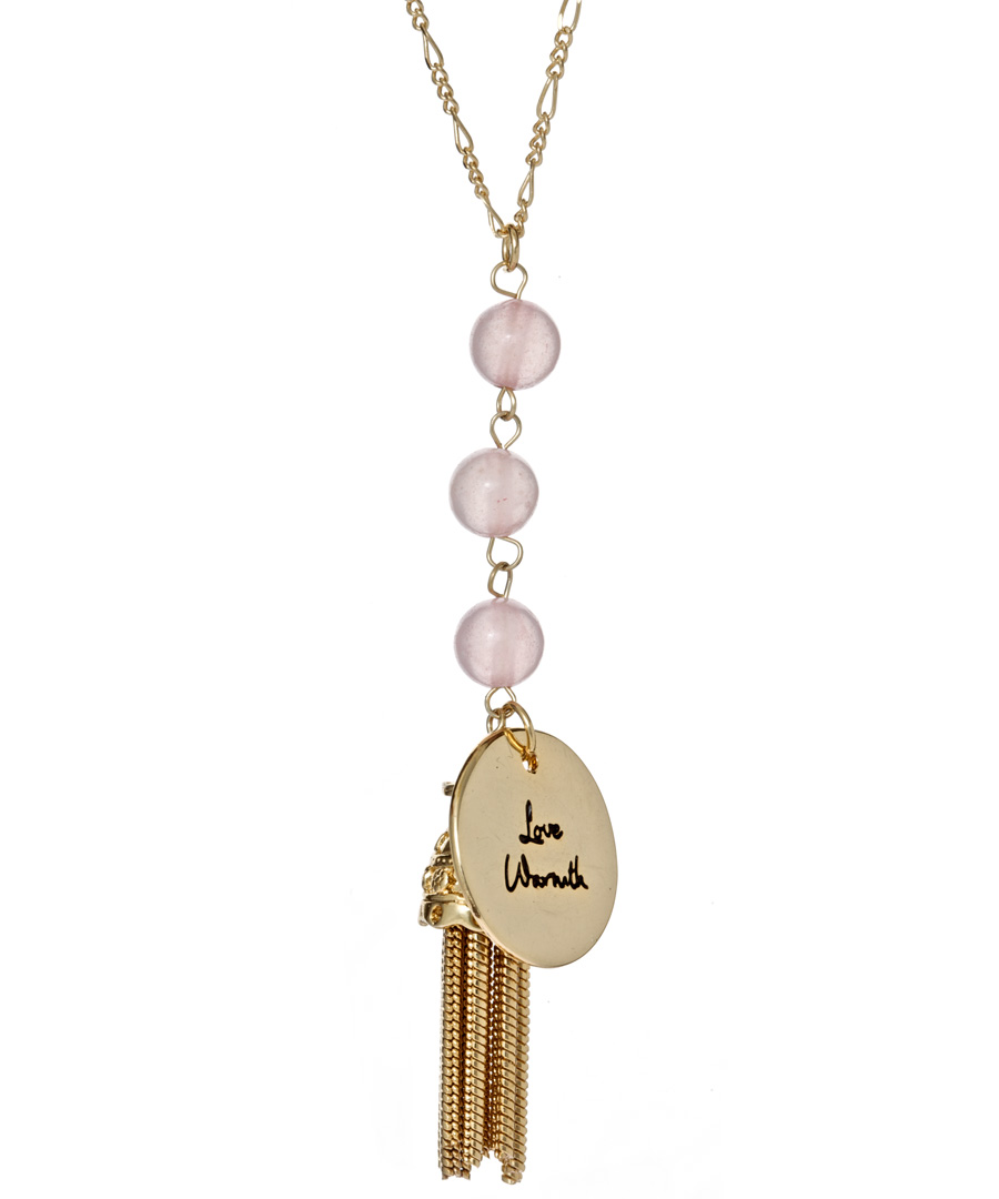 Bee Charming love and warmth inspiration necklace is wonderful. Three semi precious rose quartz beads are said to bring intuition and healing to the wearer. Hanging below the beads, a gold plated disc inscribed with "Love" and "Warmth" and a gold plated tassel bring even more beauty to the piece. The pendant measures 3 inches long and hangs from a 26 inch gold plated Figaro chain with a 2 inch extension. Necklace fastens with a lobster claw clasp.