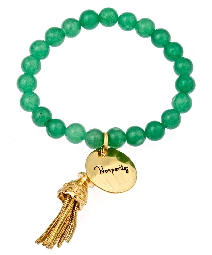 Bee Charming prosperity inspiration bracelet is sensational. Vibrant semi precious green aventurine beads strung around your wrist are said to inspire prosperity. An inscription of the inspiration appears on a gold plated disc that hangs from the bracelet along with a 2 inch long gold plated tassel. Bracelet stretches to fit most wrists.