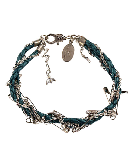 Bee Charming's safety pin braided bracelet is a grown up, punked out version of your childhood friendship bracelets. Aqua or pink leather braids are interwoven with safety pins, chains and charms for a DIY, rock all night look that retains a hint of innocence.