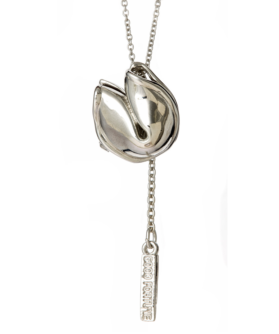 Bee Charming silver good fortune necklace is fantastically unique. This beautiful silver plated necklace features a fortune cookie-shaped locket that comes to you in a small silver rice box. Hanging from the locket is a tag with your choice of fortune, including "Love," "Luck," "Fame," "Happiness," "Health," "Success," and "Wealth" that can be worn inside or outside of the cookie. The pendant measures 2 1/4 inches long and hangs from a 17 inch chain. Necklace fastens with a spring ring clasp. Please note inscription choice in the notes at checkout.