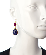 These bright, happy, and swingy cherry ruby and lapis drop earrings from Belair were made to brighten your look! They feature genuine faceted lapis teardrops dangling from blushing rough cut rubies. With their amazing colors, these earrings have a Mediterranean flair to them.