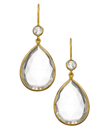Sparkling and chic, these drop-dead gorgeous crystal quartz teardrop earrings from Belair offer a true look of elegance for that special occasion! This breathtaking pair features large clear faceted quartz teardrops surrounded by a gold vermeil trimming. These elegant beauties are simply lovely to look at.