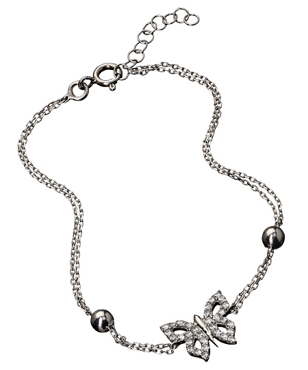 Unlike a real butterfly, if you get a hold of this double chain butterfly bracelet you'll never have to let it go. The sterling silver bracelet features two layers of chains and two silver beads. The butterfly pendant provides a striking focal point. This bracelet fastens with a spring ring closure.