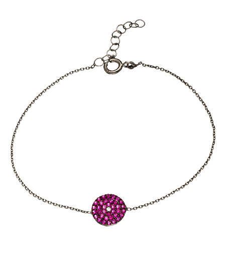 Add a tiny hint of elegant color to your look with Belair's fuchsia CZ disc bracelet. This runway inspired bracelet features a small disc made with bright pink-hued fuchsia cubic zirconias on a slim oxidized silver or gold vermeil chain. It's a gorgeous way to accent formal outfits.