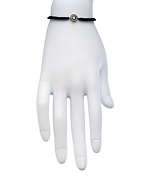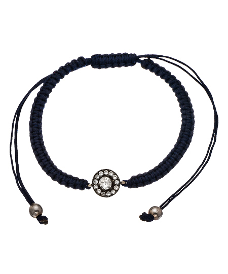 style repertoire. A hand-braided dark blue macrame cord is adorned with a sparkling round charm dotted with brilliant cubic zirconias. This adjustable bracelet is