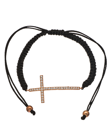 With its exquisite design, this elegant sideways cross black macrame bracelet from Belair reveals a subtle, yet modern reflection on faith. The rose gold cross is crafted with cubic zirconia stones and curves horizontally on an adjustable hand-braided macrame cord. It's perfect for wearing anytime.
