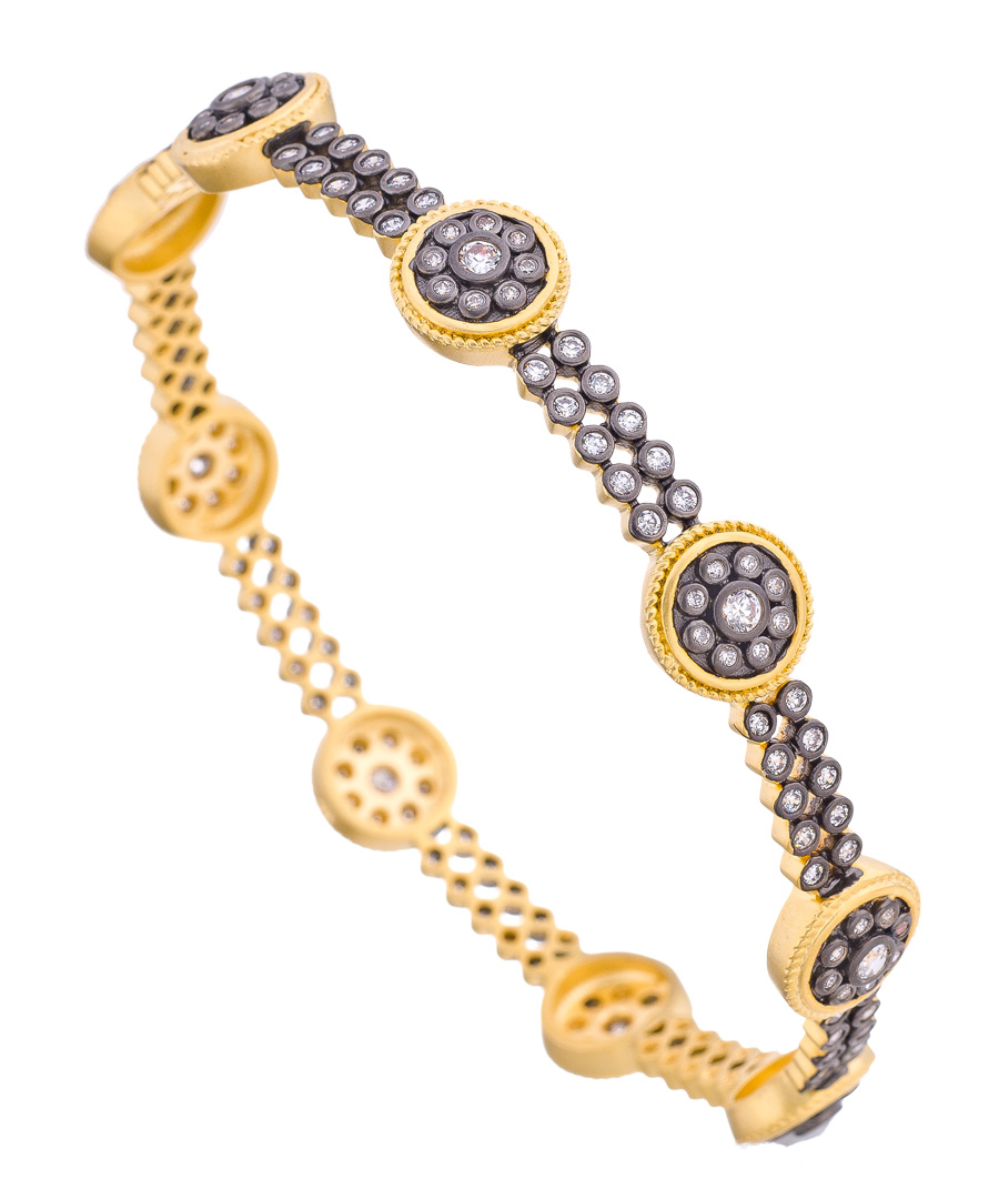 Check out the beautiful contrast of the gold and rhodium plating in this nautical button bangle from Belargo. Deep sea treasure hunters would certainly be jealous of this great find. Add the sparkling beauty to your collection today and you won't be sorry.